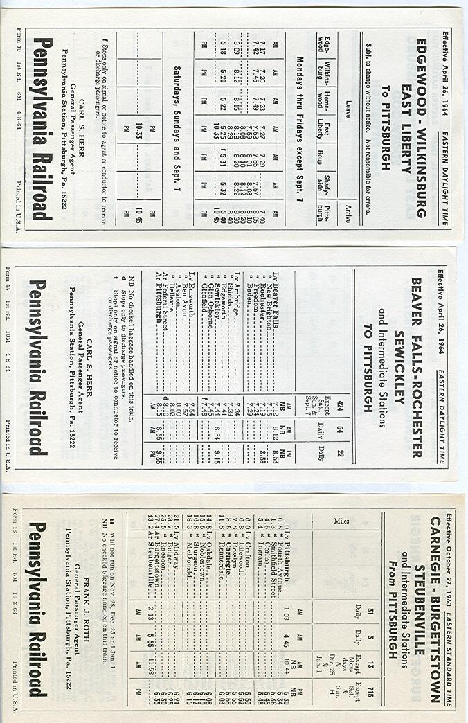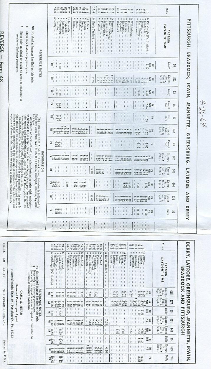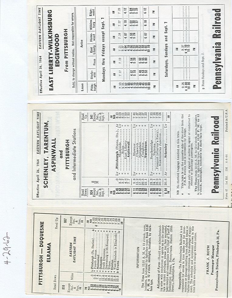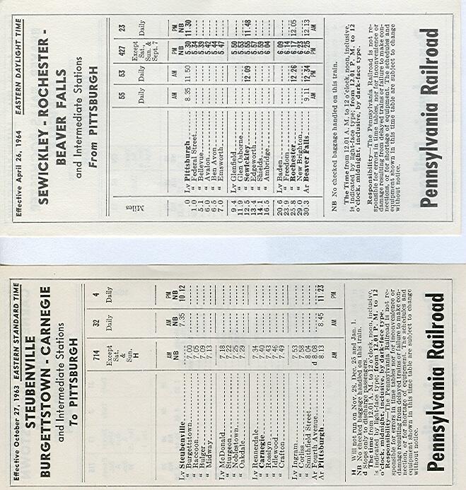 Attached are scans of the five final 1964 PRR commuter timetables , plus the 4/29/62 Elrama timetable that I believe was the last one  for that line . In the interest of reducing the number of scans, the "To" and "From" sides of some timtables are shown on two scans.