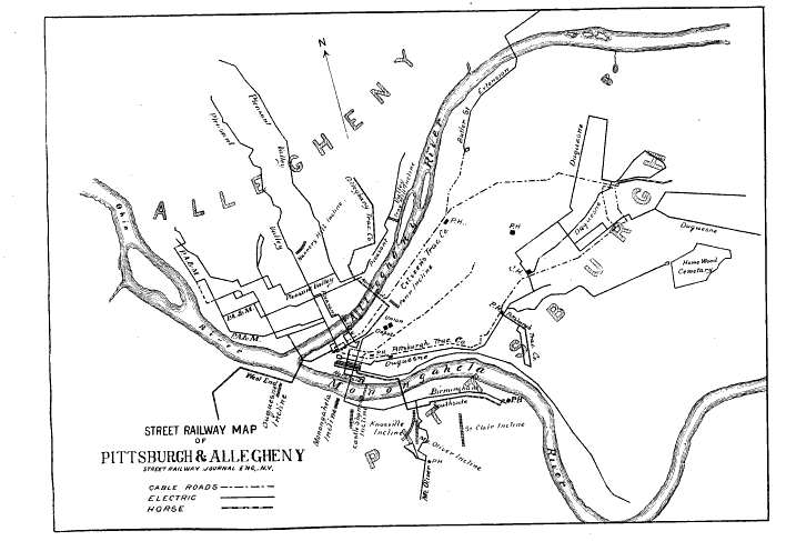 > >Final part - map might be attached - better image in pdf copy of Street Ry Journal THE NUNNERY HILL INCLINE.The second of the Allegheny inclines ascends Nunnery riveted plate girders, five feet deep. The rails are sixty pound steel T, spiked to 10 x 12 ins. white oak ties.There is a powerful hoisting plant, consisting of a pair of 24x36 ins. engines, built by the Scaife Foundry & Machine Co. The drums are of cast iron, grooved for ropes, and eighteen feet in diameter. The cars are heavily built of iron, with floors 16x38 ft. There are three cables, two two and one-quarter inch hoisting ropes, and one two inch safety rope. The cables are supported on the incline by ten inch grooved cast iron pulleys. The gauge is ten feet. The entire structure is very massive in its construction, over 750 tons of iron being used in the bridge work alone, but the structure has considerable gracefulness in its bold step from the street to the hillside. The entire cost