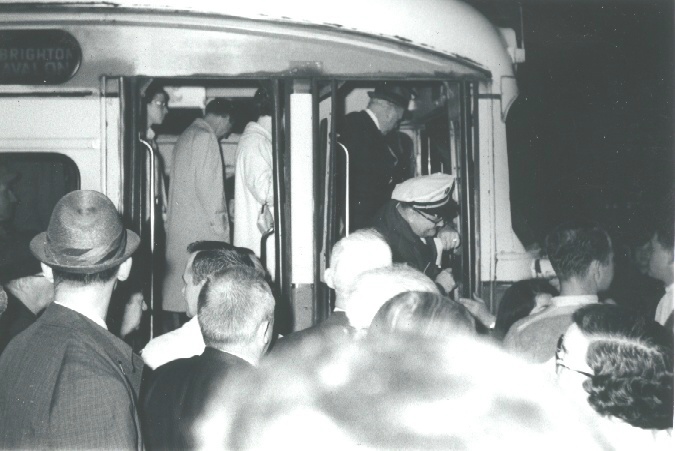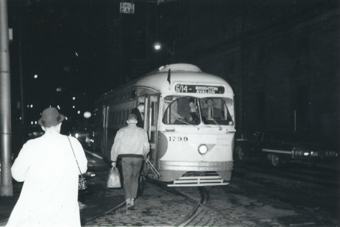 > I took the attached photo as the riders were starting to re-board 1799 in Avalon. I believe that's John Dameron in the black coat talking to the motorman. Time was around 1:00 am on Sunday, May 1, 1966.