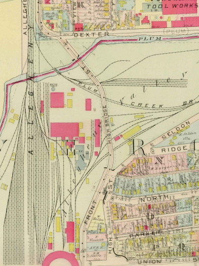 > The present day Allegheny River Boulevard appears to stay closer to the railroad line, apparently passing through an area that in earlier days was occupied by the railroad's shops and roundhouse. So, yes, the strip occupied by Oakmont Avenue in the photo is now occupied by Allegheny River Blvd. To the right of and behind the camera, ARB more or less replaced Front Street. Dexter Street is now called Plum Street, although I now see that the Hopkins map identifies that as Dexter (Plum).