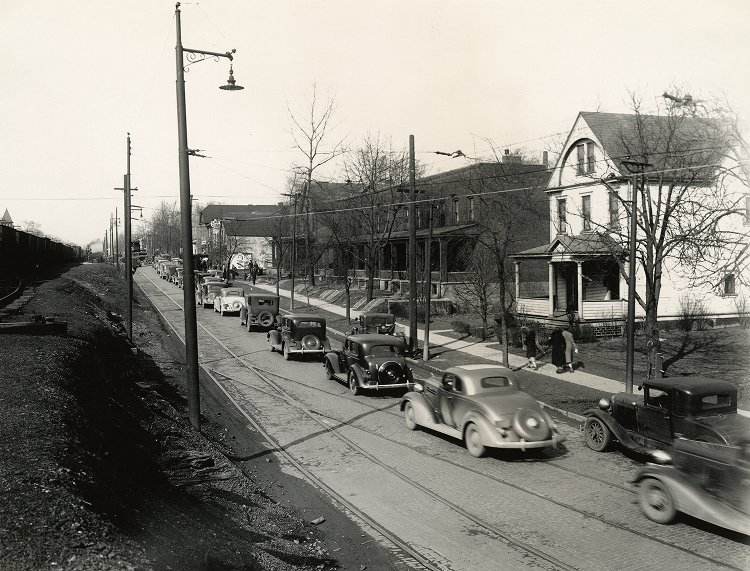 Description of photo: "Traffic on Oakmont Avenue was common. Streetcars merging onto the same track and rail traffic caused frequent back-ups, long delays, and stop-and-go traffic. This picture shows the traffic build up as a result of both streetcar and rail traffic."