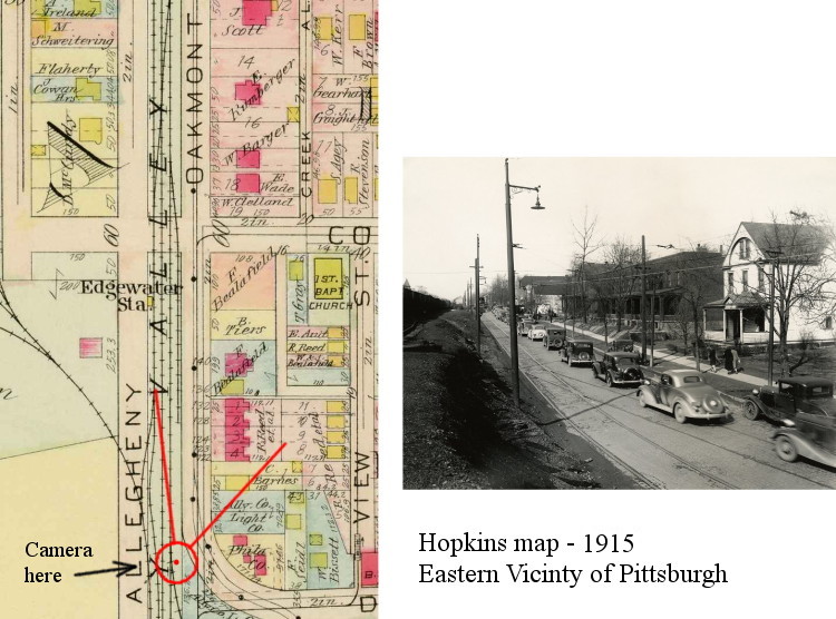 The red circle with a couple lines radiating from it marks where I think the cameraman stood to take the picture. As can be seen on the map, the street visible in the photo is Oakmont Avenue.