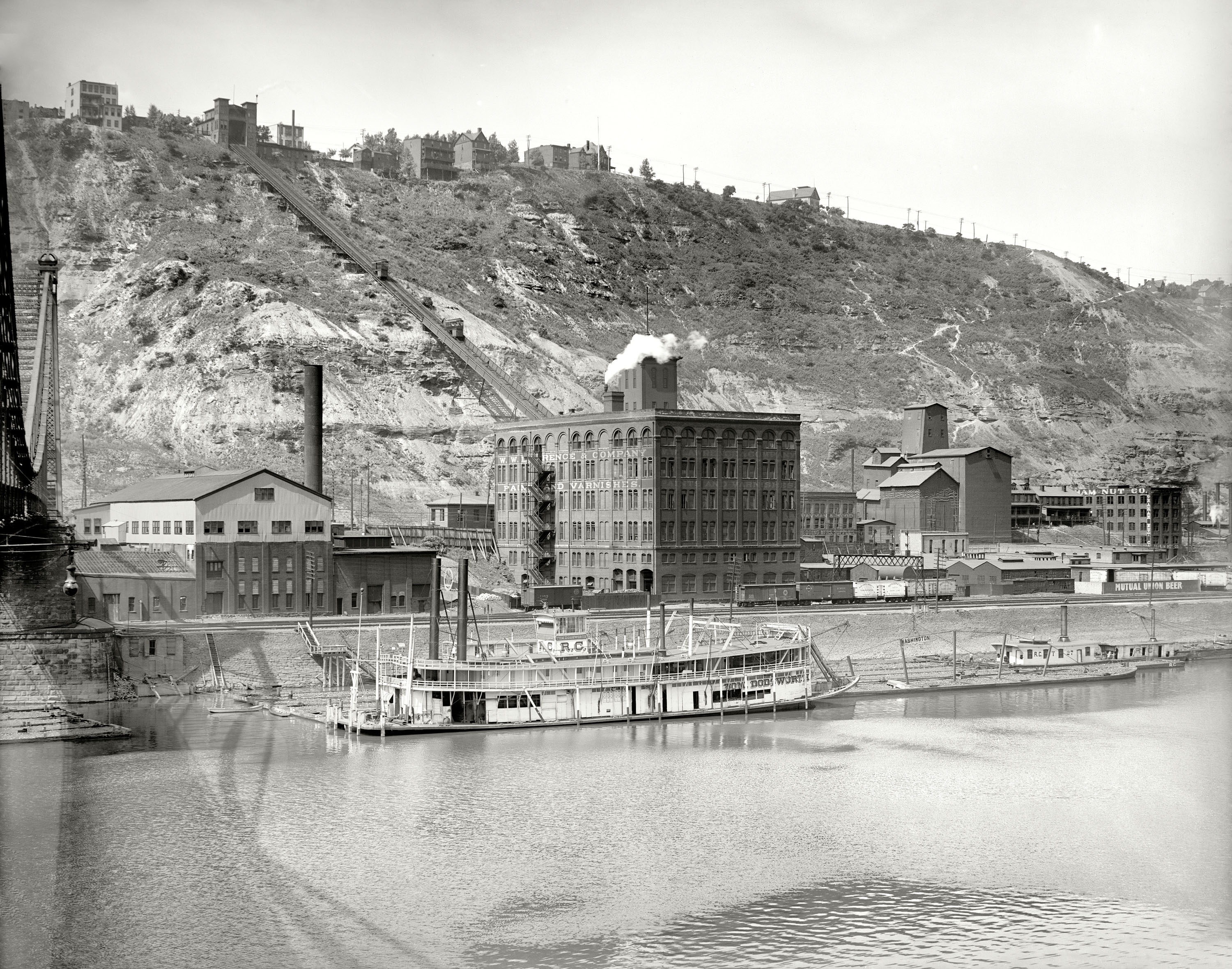 Attachment 002, John, was the old Point Bridge. The paint warehouse was in the center. The West End Car House is the building with the tall stack just to the right of the bridge.