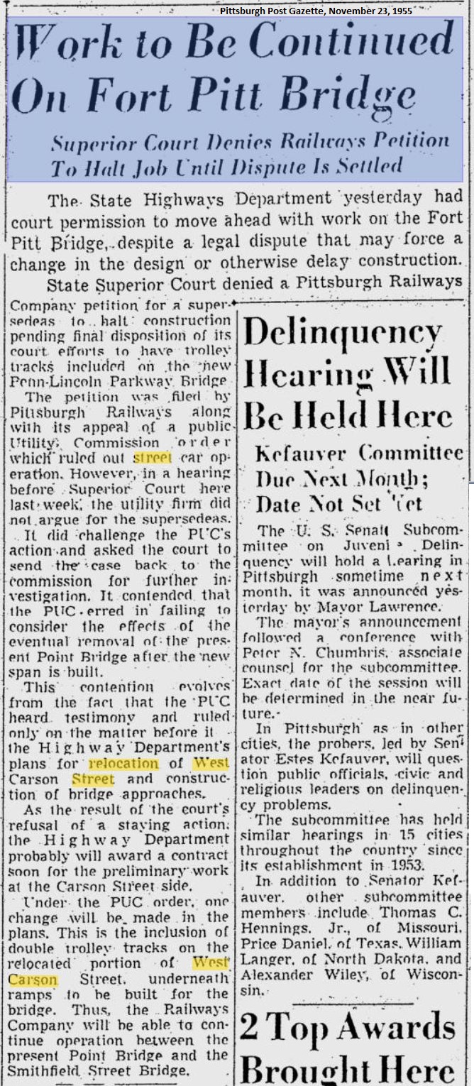 My hunch is this was discussed somewhere in our West End Lines discussions, and if so, please forgive any replication. But, since the file cabinets in my mind are so full right now, my memory is searching, but not finding the item that - the PUC approved tracks on a renovated West Carson Street (being relocated due to Fort Pitt Bridge ramps), but not on the new bridge.