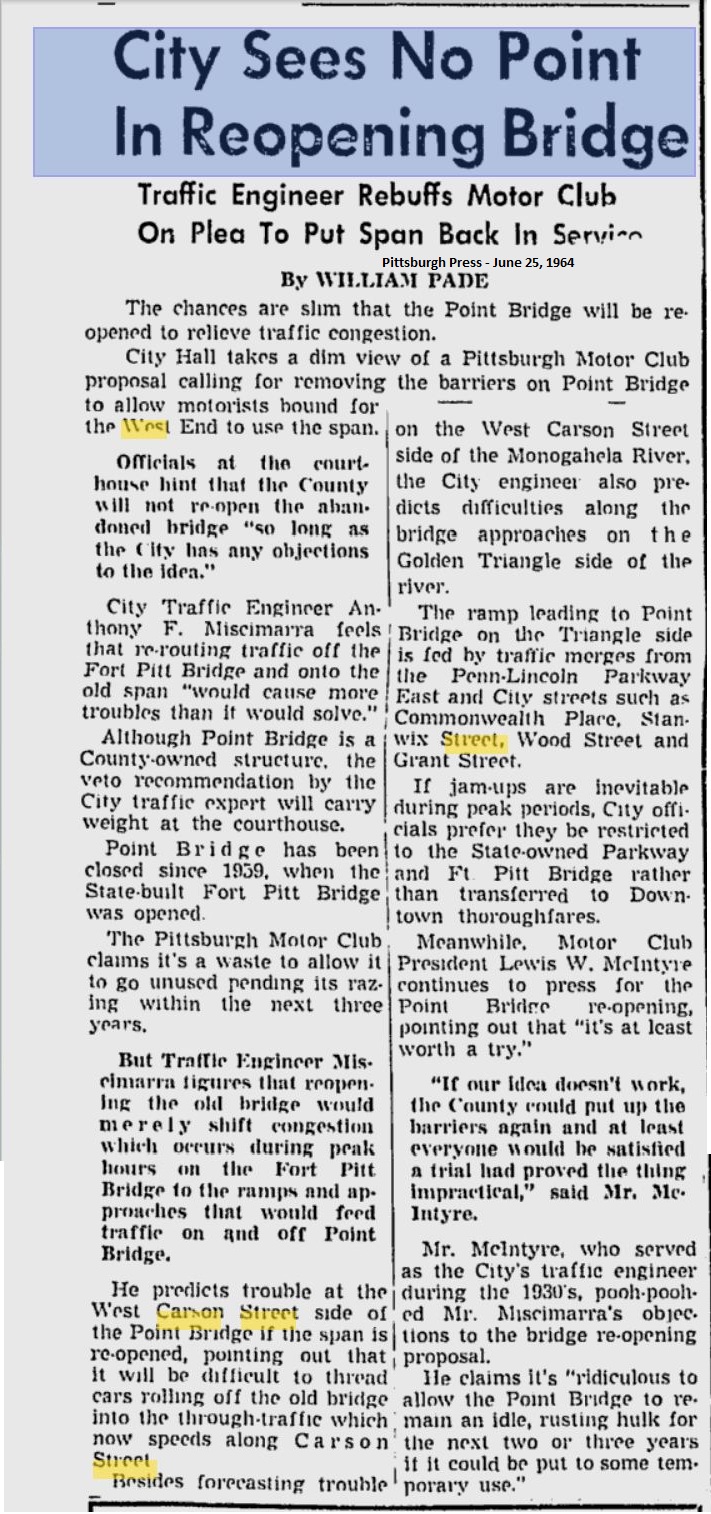 Interesting article in the Pittsburgh Press, June 25, 1964, just a couple years after the arguments about leaving track and wire in place in case the West End lines went back into operation.