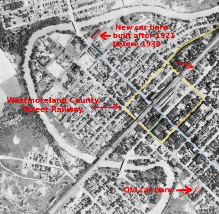 Yellow line marks the route of the Westmoreland County Street Railway.