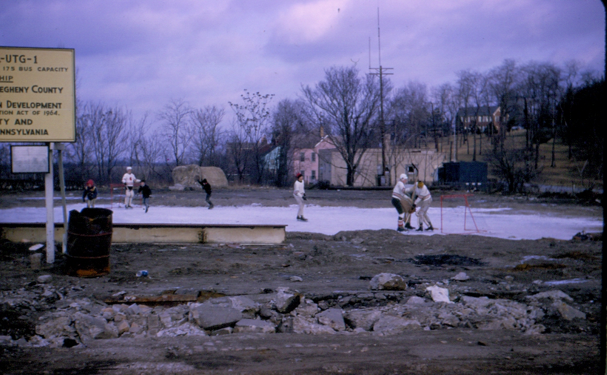 The last day for operations at Keating CH (routes10 and 15) was 9/4/65. After that date, the remaining North Side routes (14 and 21)operated out of Tunnel CH until they were discontinuted on 4/30/66. Attached is a photo of the Keating administration building that I took on 2/27/65 when it was still active (note that PAT had removed the name "Comany" from the "Pittsburgh Rwailways Company" name on the second floor of the building). The second photo shows the empty barn and yard on 9/5/65, the day after abondonment. The Keating facilites were demolished in the Fall of 1965 in preparation for building PAT's Ross Bus Garage. However, the property remained in use - sort of - and on 1/16/66 I took the last photo showing the neighborhood ice rink among the rubble.