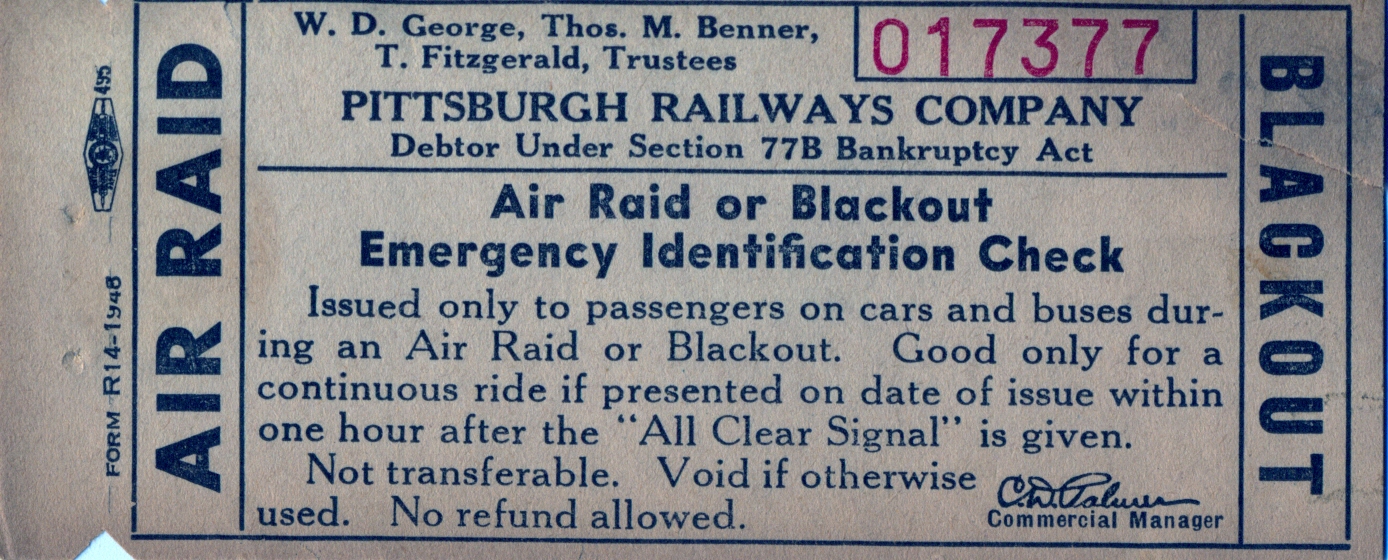 Here is a scan of a ticket issued by PRC in 1948. I remember air raid blackouts during WWII, Mr. Oklata our street's Air Raid Warden coming around to confirm that our blackout curtains were closed and lights were turned off, and having only the dial light on our radio turned on during a blackout. Also attached is a photo of that 1940 Majestic radio which I still have - and it still works. Note the call letters of Pittsburgh radio stations above the pre-set push buttons.
