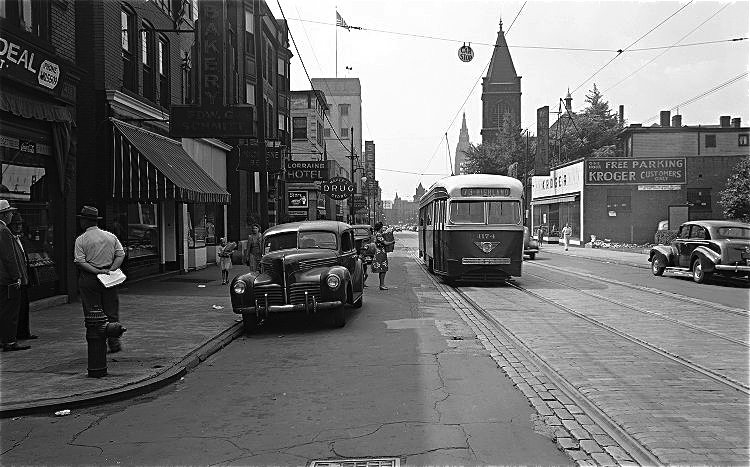 You know why I liked this? Because we regularly shopped at the Sears Roebuck store in the background. The preferred route (fastest) in the 1940s to East Liberty Presbyterian depended on traffic … it was often down to Nadine, in Ohio River Boulevard, up through Highland Park and in Highland Avenue so I saw this view many Sunday mornings or Saturdays in route to Sears, the model railroad store or the barber shop.