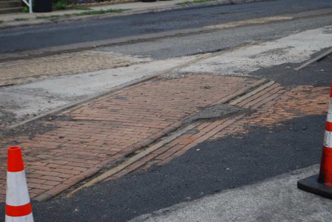 > > I am surprised they left them in, but it is PennDot doing the work not the borough. Further up Fourth Avenue, the telltale signs of tie rot are evident in the rippled pavement. Temporary inconvenience, Not so permanent improvement. As one of my former students stated, "The trolley tracks get to breath and see the light of day once again. Soon they will be paved over and be hidden for another generation to discover."