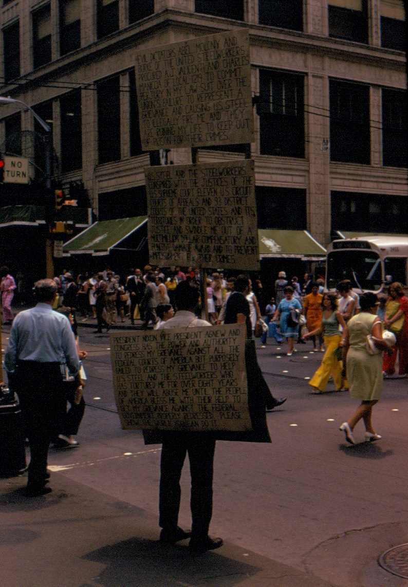 > this man carrying large signs on Fifth Ave. and around the U.S. Steel Bldg.
