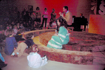Attached is a photo I took on the Mr. Rogers set at WQED-TV in 1979. Our daughter Colleen is wearing the blue dress at the far left in the photo, and our son Jarrett is to her right, about to climb over the low wall to meet Fred Rogers.