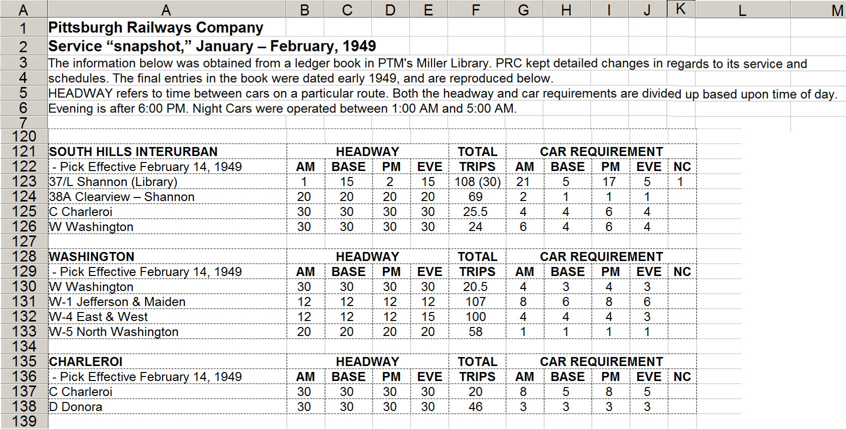 The chart which you sent does not mention AM and PM trippers from and to Riverview and Canonsburg. These services were being provided at that time. It also does not show any Charleroi-Roscoe (Elco) nor any Washington-Canonsburg service. I think there was still some running at that time, but I'm not so clear on that.