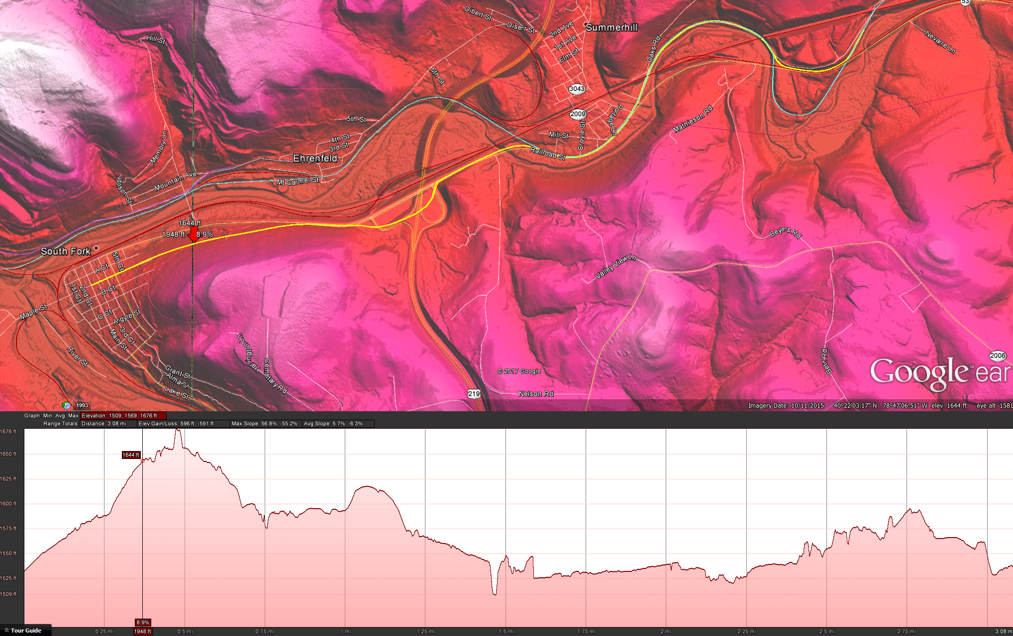 Attached is a colored DEM of the area with my tracing of the Penn Central Ry right of way in yellow and an elevation profile below it. The PRR tracks in in Red, the original Portage RR is in light blue. The Southern Cambria Ry is in purple. When I have some time (maybe in a couple of weeks) I’ll use the Lidar to create a more accurate elevation profile rather than whatever Google Earth is using. I’ll also georeference the 1938 aerial.
